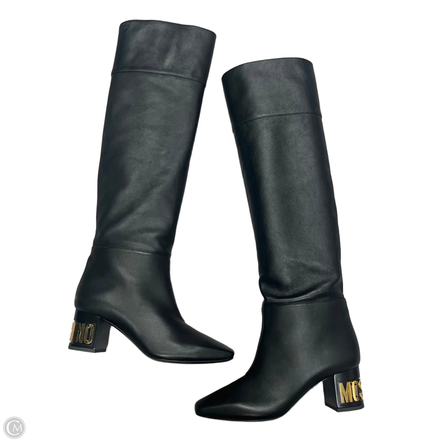 Boots Luxury Designer By Moschino In Black & Gold, Size: 8.5