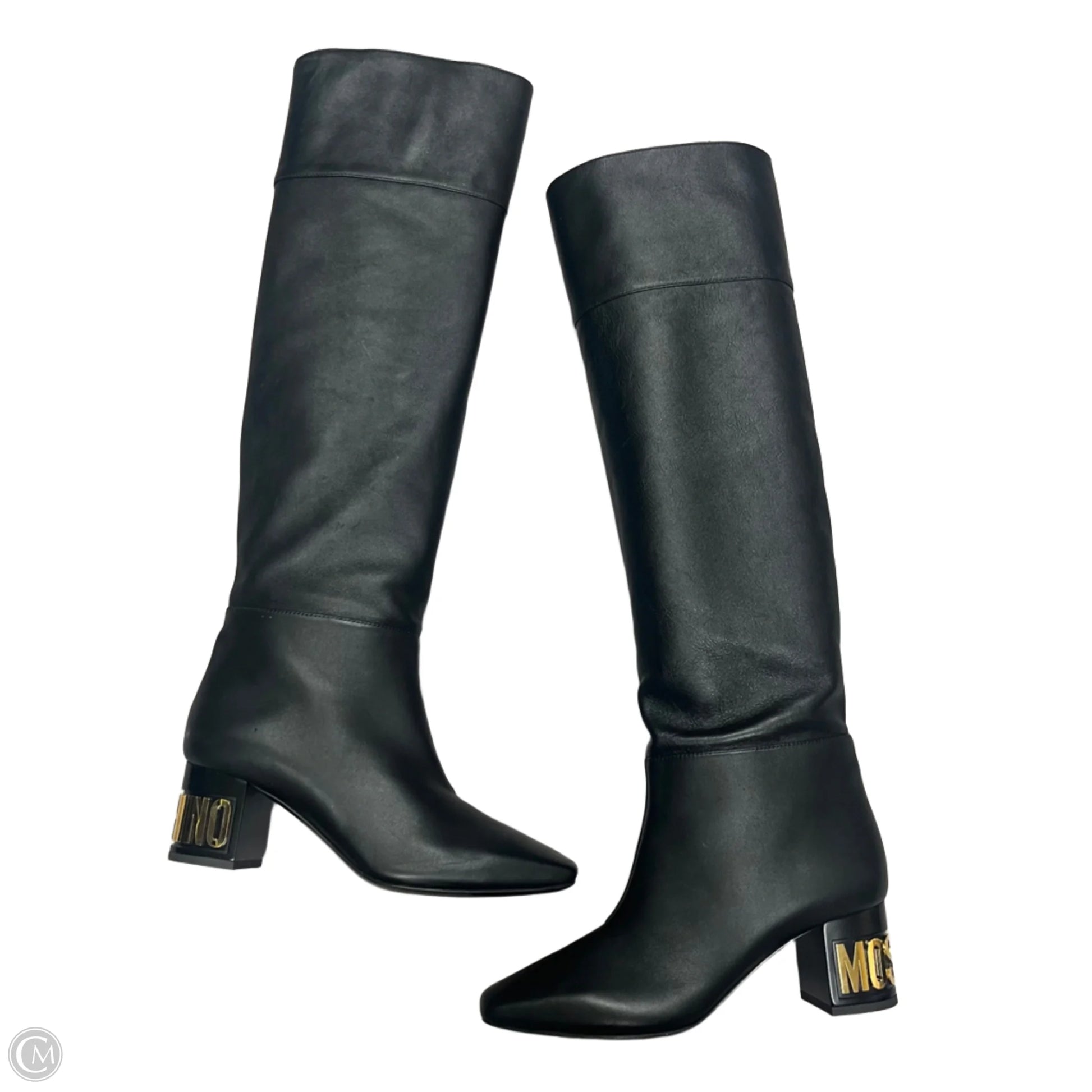 Indulge in opulence with these Moschino designer boots in chic black & gold, size 8.5. Step into luxury today!